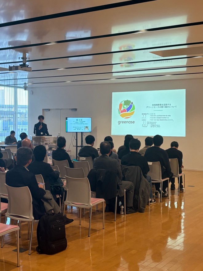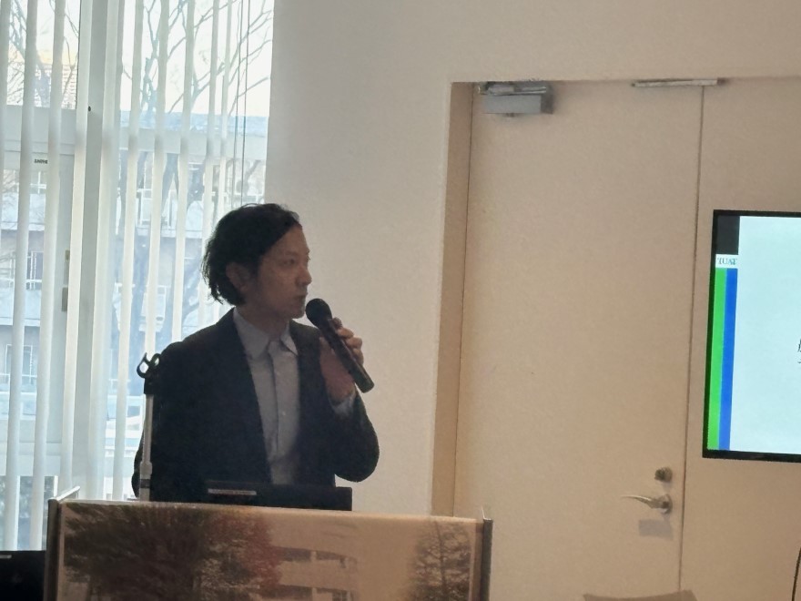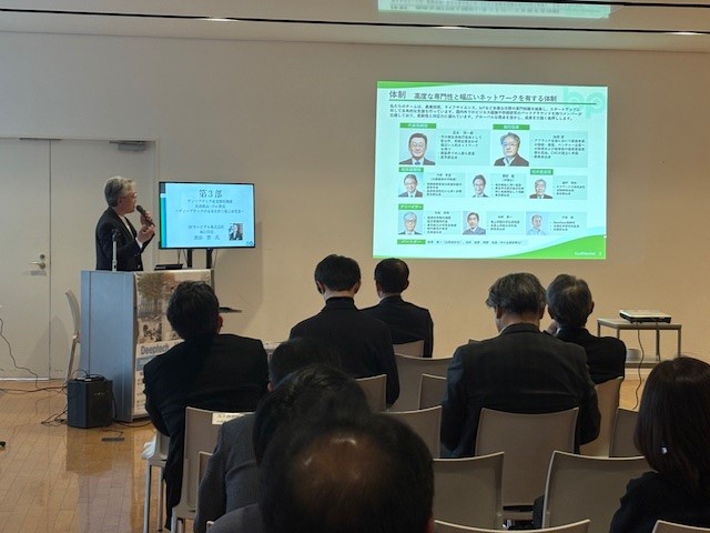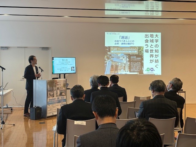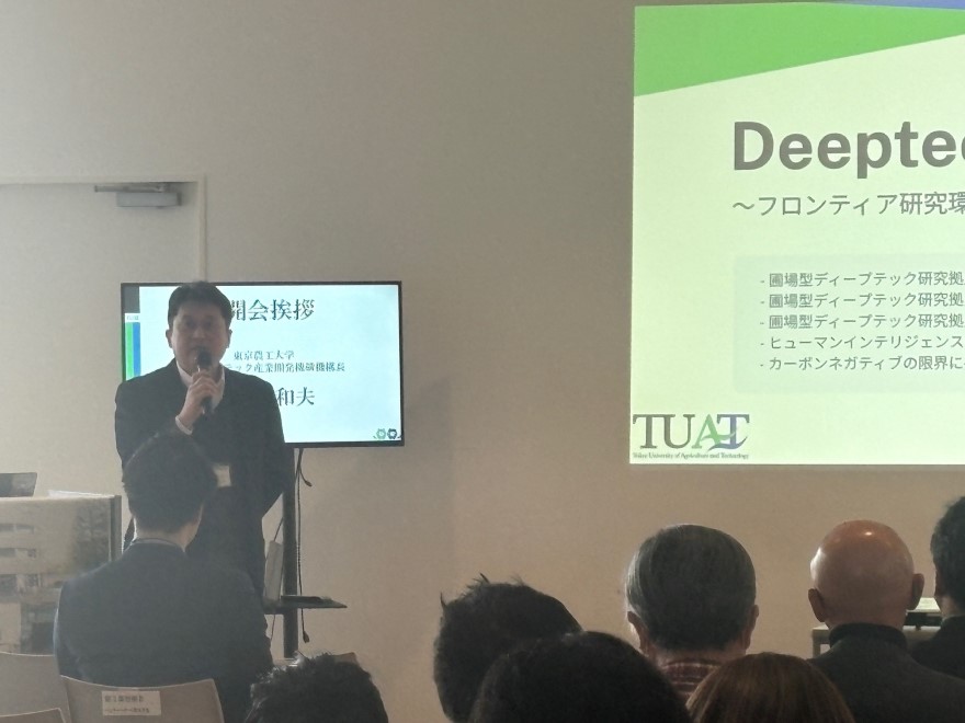第3部は、「ディープテックの未来を担う場と研究者」のテーマにて、吉田誠西東京国際イノベーション共創拠点長より、2025年に府中キャンパスに設立された施設「邂逅館」についてのご紹介。共創拠点入居企業からの発表として、農工大発ベンチャー企業の株式会社グリーンエース中村慎之祐代表取締役CEO、および農工大と民間VCによる初の認定ファンドを組成したBPキャピタル株式会社濱田智執行役員からの企業紹介。PoC関係教員の工学部応用化学科村岡貴博教授による「PoC関係教員の研究活動と社会実装・起業への展望」についてご説明いただきました。