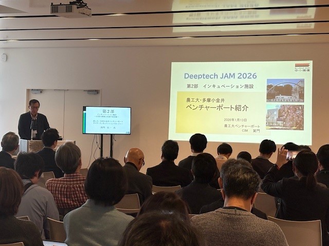 2026年1月13日(火曜)に農工大小金井キャンパスのエリプス3階多目的ホールにおいて、農工大ディープテック産業開発機構主催の「Deeptech JAM 2026」が行われました。農工大・多摩小金井ベンチャーポートは、第2部「インキュベーション施設、企業の挑戦と技術の最前線」にて、ベンチャーポート施設紹介、株式会社346、エアロディベロップジャパン株式会社、株式会社モトックスの3社の企業紹介の機会を設けていただきました。