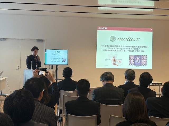 エイジングワイン研究所、田邉貴昭所長は、株式会社モトックスの企業紹介、およびエイジングケアワイン研究所設立に至った経緯などについて紹介し、老化の三大要素「酸化」「糖化」「炎症」の中の1つである「糖化」についての説明と、抗糖化作用におけるワインの可能性についてお話されました。