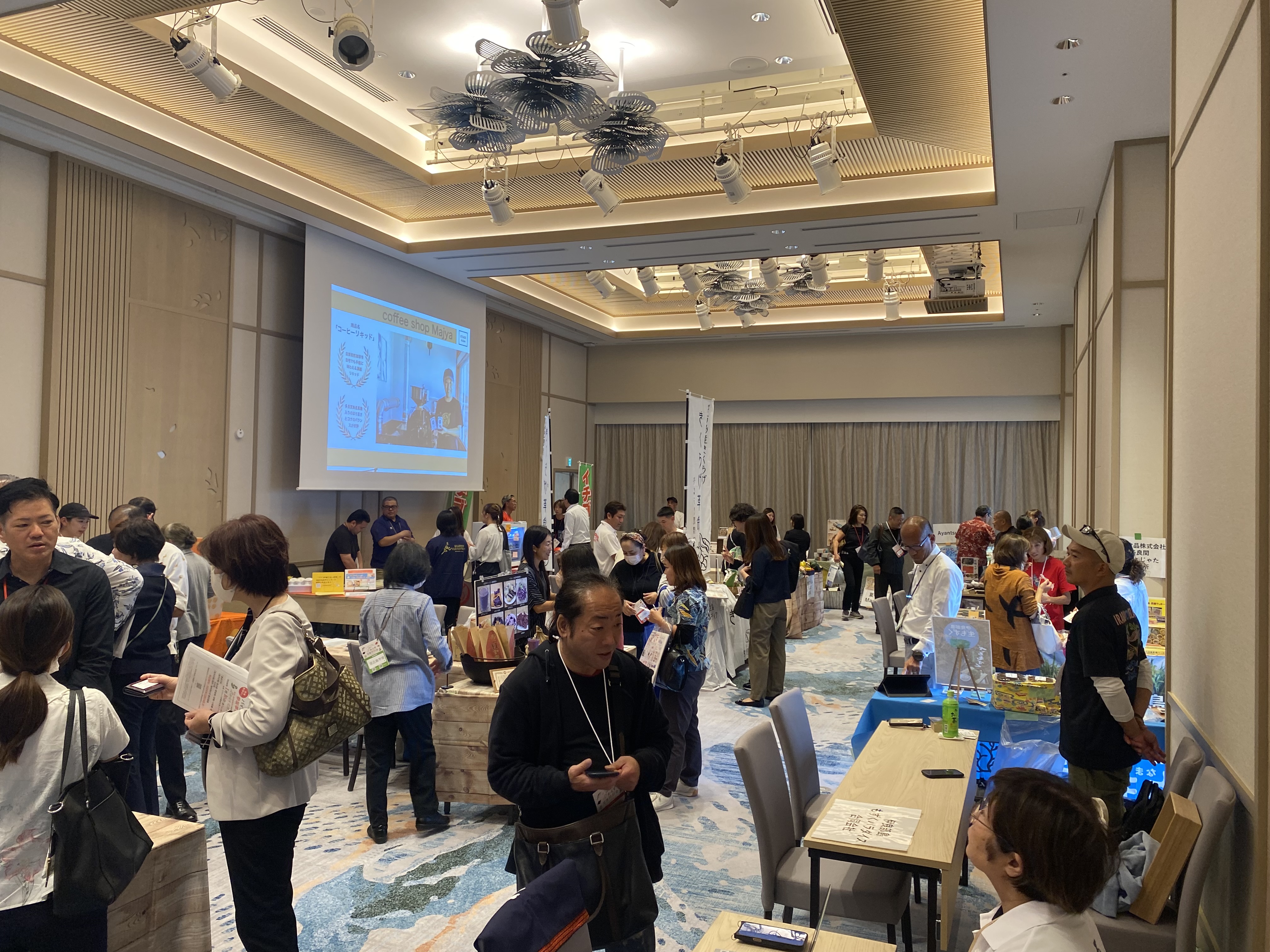 「島内作り人と島内買い人を繋ぐ場」として開催された本商談会では、農産品から加工品、飲料、雑貨や化粧品まで様々な商品が並び、多くの来場者で賑わう中、各所で活発な商談が交わされていました。