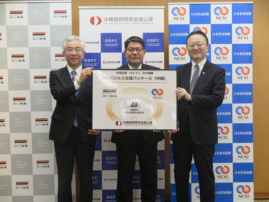 2024年11月22日、沖縄公庫、NEXI、中小機構の3者による「海外ビジネス支援パッケージ(沖縄)」を構築して、沖縄県内の事業者の海外販路開拓を支援しています。2025年11月からは、琉球銀行、沖縄銀行、沖縄海邦銀行及びコザ信用金庫が本パッケージに参画し、海外ビジネス支援を強化しています。